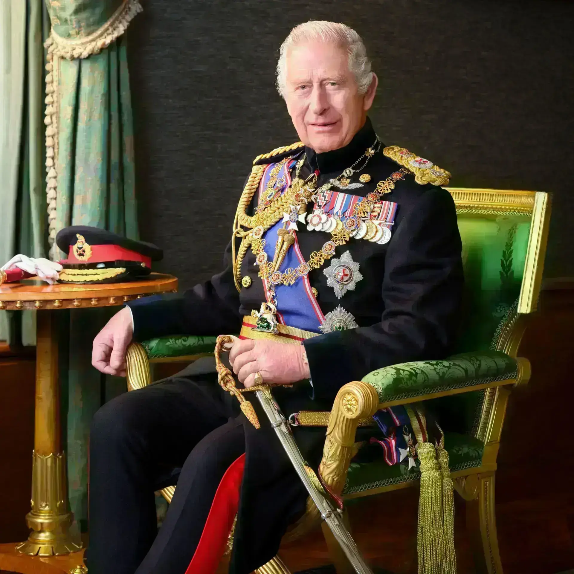 Η φωτογραφία – που τραβήχτηκε στον Μεγάλο Διάδρομο του Κάστρου του Ουίνδσορ – δείχνει τον μονάρχη καθισμένο να φορά την τελετουργική στολή του Στρατάρχη με μετάλλια, σπαθί και διακοσμήσεις.
