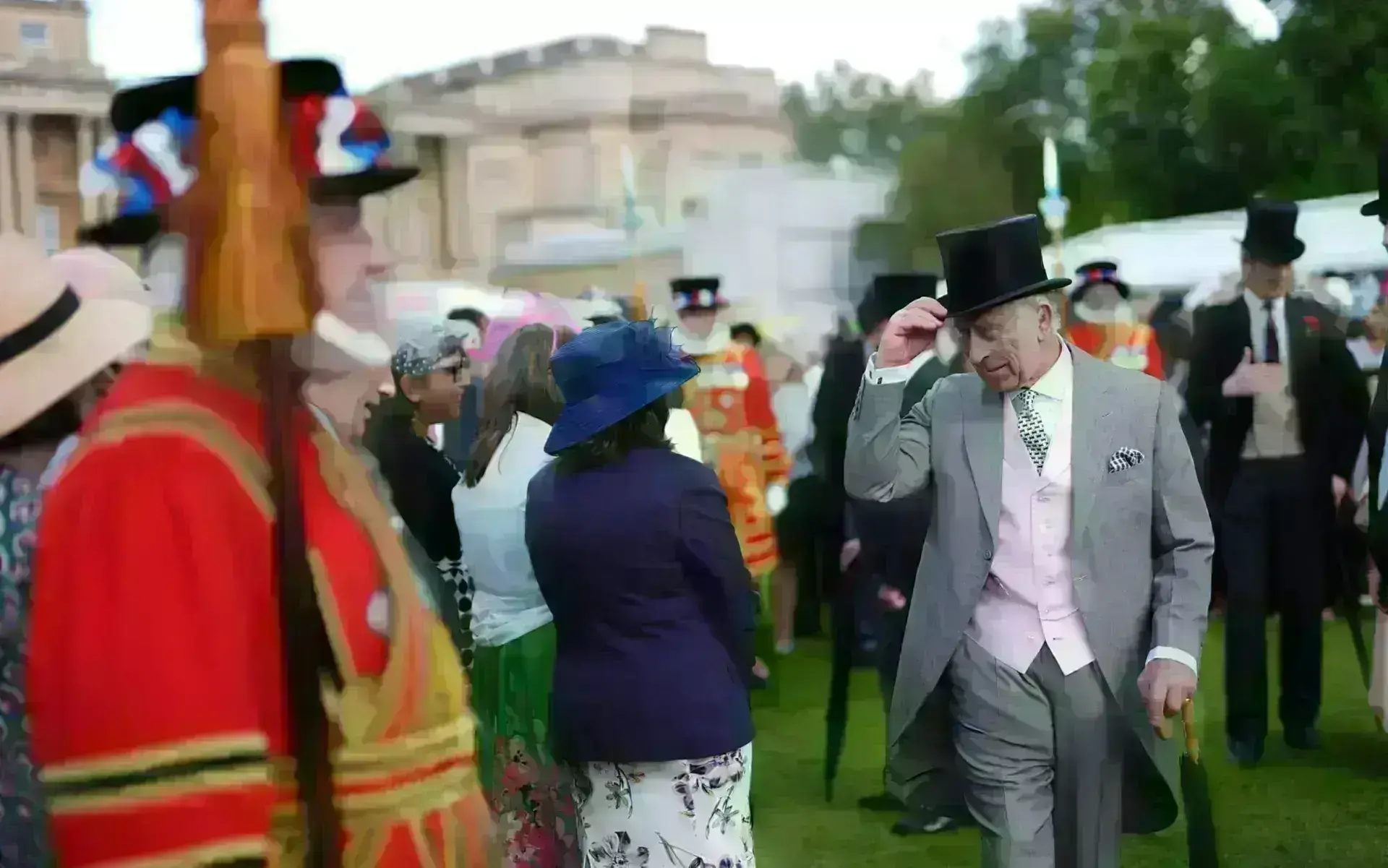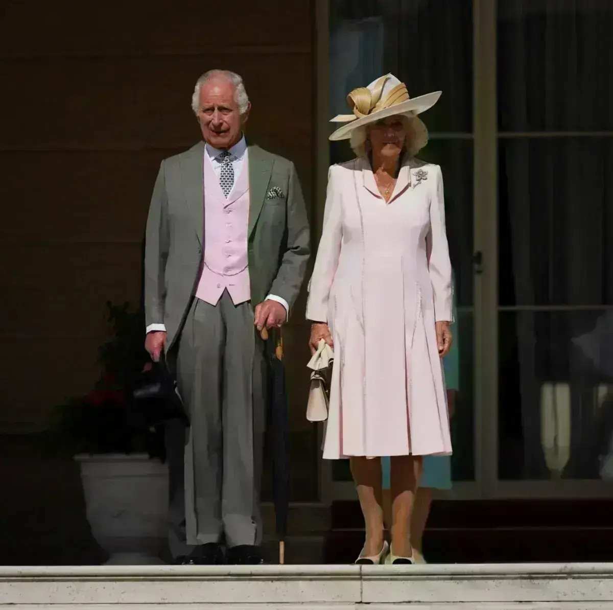 Ο πρίγκιπας Κάρολος, φορώντας ένα γκρι κοστούμι σε συνδυασμό με ένα ροζ γιλέκο και καπέλο, έγινε δεκτός με χαμόγελα καθώς έβγαινε στον κήπο από το παλάτι. Η Δούκισσα της Κορνουάλης επέλεξε ένα κομψό παλτό φόρεμα σε απαλό ροζ κρόσσια, σχεδιασμένο από την Anna Valentine, συμπληρωμένο με ένα καπέλο Philip Treacy και πρόσθεσε μια πινελιά λάμψης με την καρφίτσα με ροζ διαμάντι της αείμνηστης Βασίλισσας.