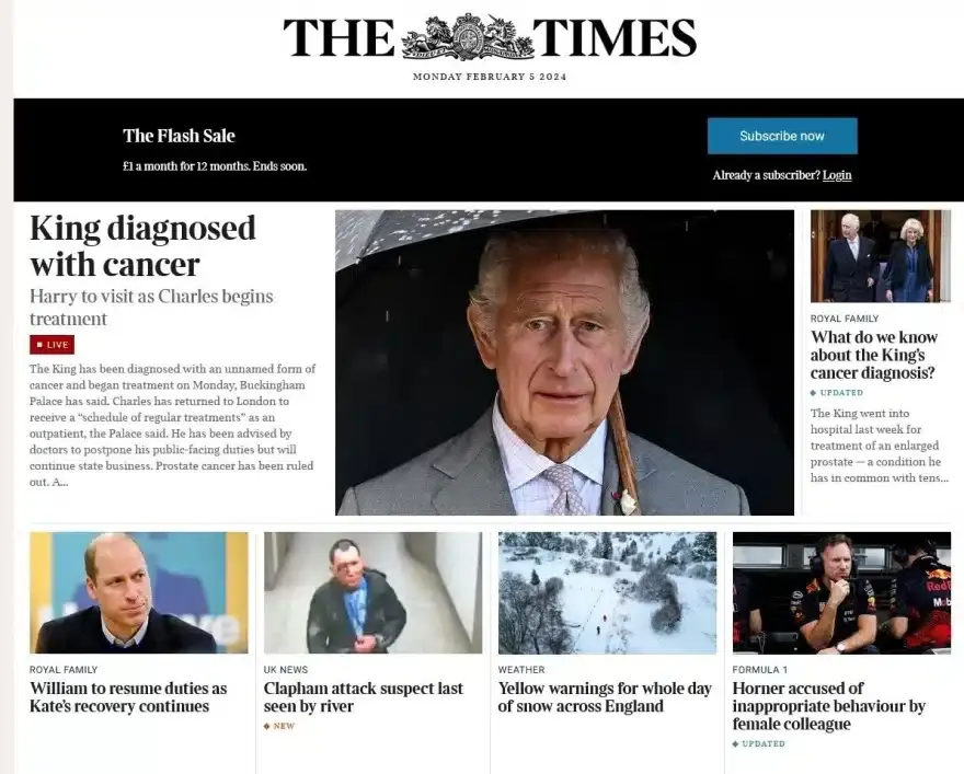 H Sun έχει μεγάλο τίτλο «Η μάχη του Καρόλου με τον καρκίνο», επιλέγοντας και αυτή να δώσει έμφαση στην παρουσία του Χάρι τις επόμενες ημέρες.