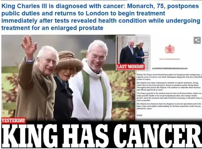 «Σοκ από τον καρκίνο του Καρόλου» γράφει η Mirror που επισημαίνει ότι η διάγνωση έρχεται 10 ημέρες μετά την επέμβαση για καλοήθη υπερπλασία προστάτη.