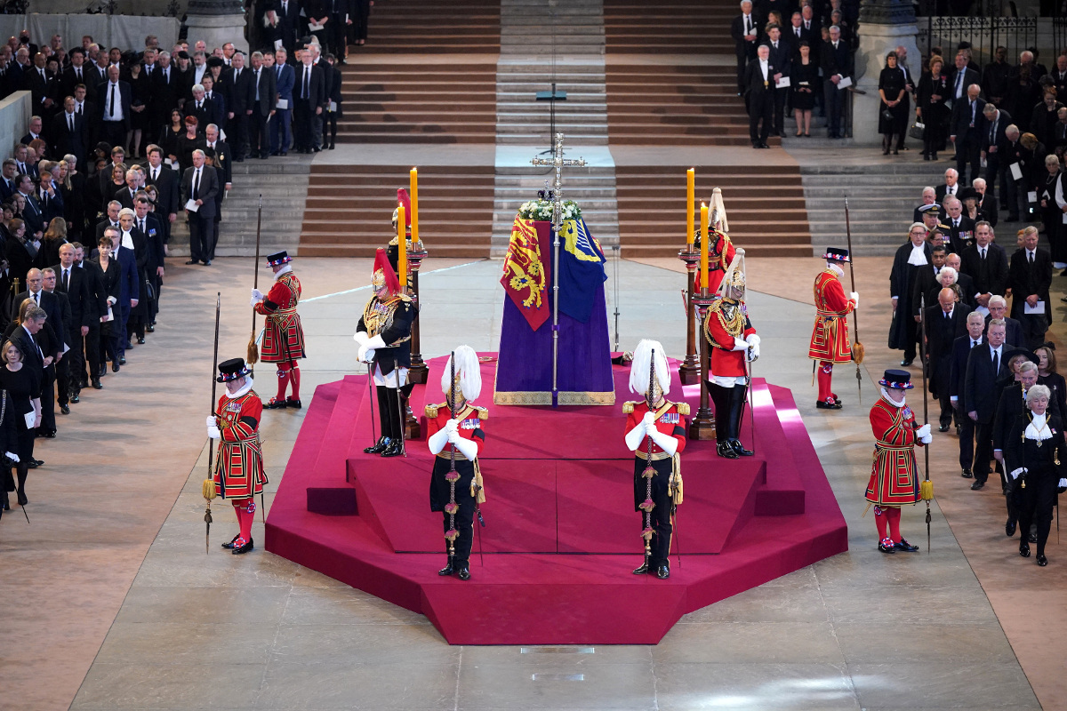 Η πομπή που μετέφερε τη βασίλισσα Ελισάβετ από το Ανάκτορο του Μπάκιγχαμ στο Γουέστμινστερ Χολ έφθασε στον προορισμό της και εναποτέθηκε σε υπερυψωμένο βάθρο, όπου θα παραμείνει ως τη Δευτέρα για το λαϊκό προσκύνημα στην εκλιπούσα μονάρχη.