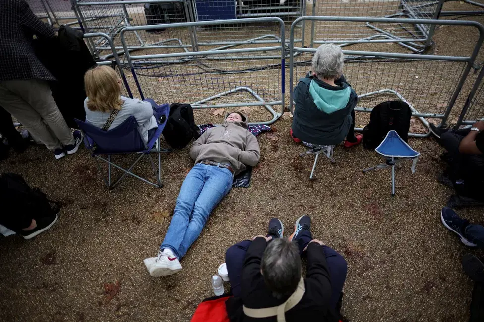 Η τεράστια ουρά συντονίζεται από ειδικούς φύλακες, που καλούν τους προσκυνητές να ξεκινήσουν την πορεία τους προς το Γουέστμινστερ Χολ σε ομάδες των 20. Η ουρά των προσκυνητών εκτείνεται για περίπου 8 χιλιόμετρα κατά μήκος του ποταμού Τάμεση και η αναμονή μπορεί να φτάσει για ορισμένους έως και τις 30 ώρες – σύμφωνα, βέβαια, με το χειρότερο ως τώρα σενάριο.