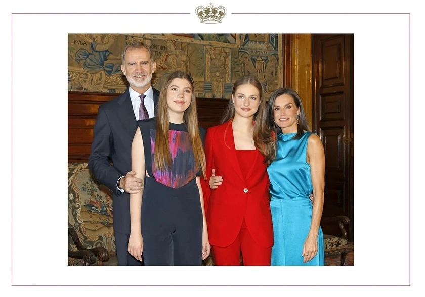 Για πρώτη φορά, η ισπανική βασιλική οικογένεια μοιράζεται ένα πορτρέτο που δεν είχε παρουςσιαστεί στο παρελθόν. Ο βασιλιάς και η βασίλισσα απεικονίζονται μαζί με τις κόρες τους, την πριγκίπισσα Λεονόρ, 19 ετών, και την Ινφάντα Σοφία, 17 χρόνων. Η 52χρονη βασίλισσα, ντυμένη με ένα σατέν γαλάζιο φόρεμα, αγκαλιάζει τη Λεονόρ δείχνοντας τη μητρική της αγάπη.