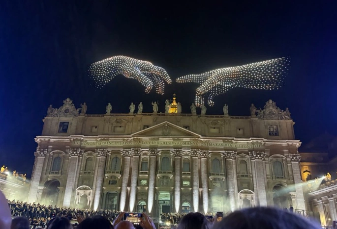 Ξεχωριστές στιγμές περιλάμβαναν την εναέρια απεικόνιση του «Θεού που δημιουργεί τον Αδάμ», της «Πιετά», καθώς και ένα συγκινητικό αφιέρωμα στον αείμνηστο Πάπα Φραγκίσκο, ενώ η λέξη «JOY» έκλεισε τη βραδιά φωτίζοντας τον ουρανό.