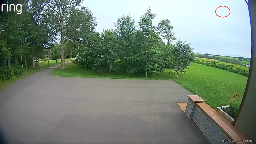 Ο Joe Velaidum και η Laura Kelly μόλις επέστρεψαν σπίτι από τη βόλτα με τα σκυλιά τους όταν παρατήρησαν έναν περίεργο σωρό σκόνης σε σχήμα αστεριού κοντά στην πόρτα τους, σύμφωνα με το ρεπορτάζ της National Post. Στην προσπάθειά τους να καταλάβουν τις συνέβη το ζευγάρι έλεγξε την κάμερα του σπιτιού του, η οποία έδειχνε έναν διαστημικό βράχο να πέφτει κατακόρυφα από τον ουρανό και να χτυπά στον τοίχο από τούβλα δίπλα στο δρόμο τους.