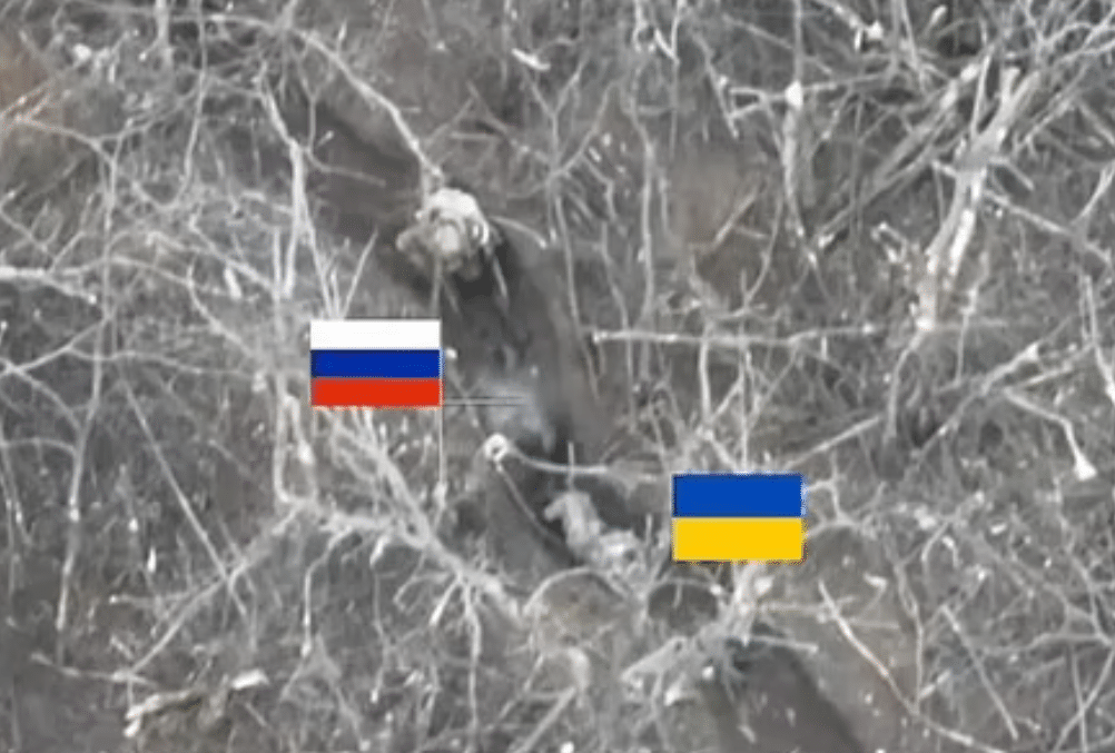 Οι Ουκρανοί στρατιώτες φαίνονται να βγαίνουν από μια τάφρο της πρώτης γραμμής πριν ρίξουν τα όπλα τους και σηκώσουν τα χέρια τους πίσω από τα κεφάλια τους για να παραδοθούν.