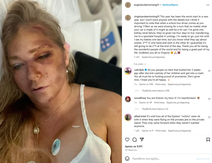 «Ανακοινώνουμε συντετριμμένοι ότι η Βιρτζίνια πέθανε χθες το βράδυ στο αγρόκτημά της στη Δυτική Αυστραλία. Αυτοκτόνησε αφού ήταν θύμα σεξουαλικής κακοποίησης και σωματεμπορίας για μια ζωή», αναφέρει η ανακοίνωση της οικογένειας.