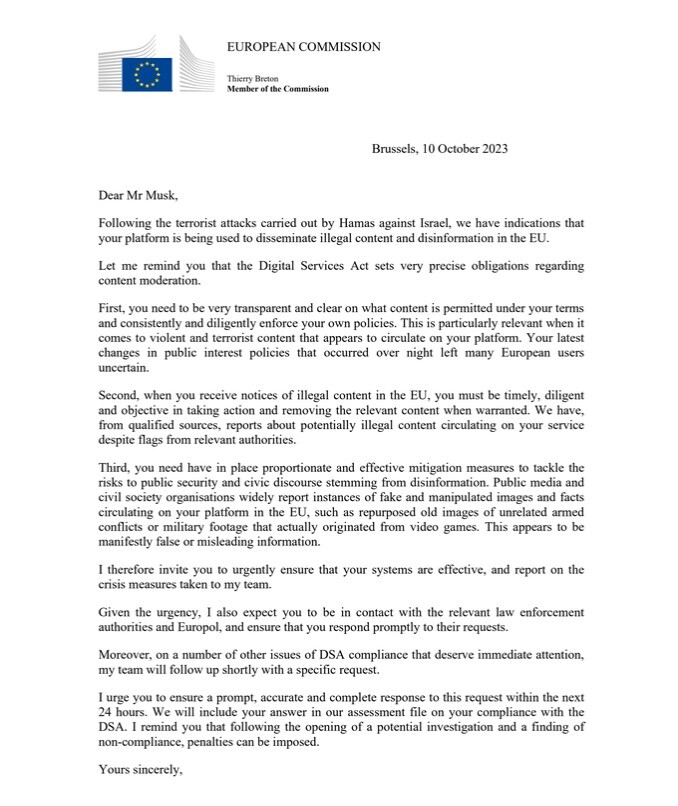 «Μετά τις τρομοκρατικές επιθέσεις που πραγματοποίησε η Χαμάς εναντίον του Ισραήλ, έχουμε ενδείξεις ότι η πλατφόρμα σας χρησιμοποιείται για τη διάδοση παράνομου περιεχομένου και παραπληροφόρησης στην Ε.Ε.», έγραψε ο Μπρετόν.
