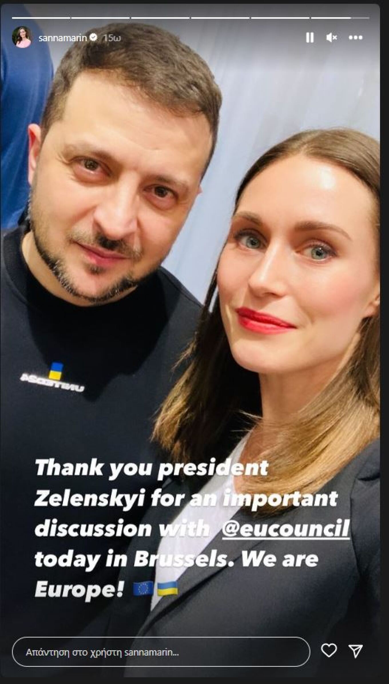 ενώ μετά την ολοκλήρωση της συνεδρίασης δεν δίστασε να τραβήξει μια σέλφι με τον Ζελένσκι, την οποία ανέβασε σε story στο Instagram. «Ευχαριστούμε πρόεδρε Ζελένσκι για τη σημαντική συζήτηση στις Βρυξέλλες. Είμαστε Ευρώπη» έγραψε η πρωθυπουργός της Φινλανδίας στην ανάρτησή της.
