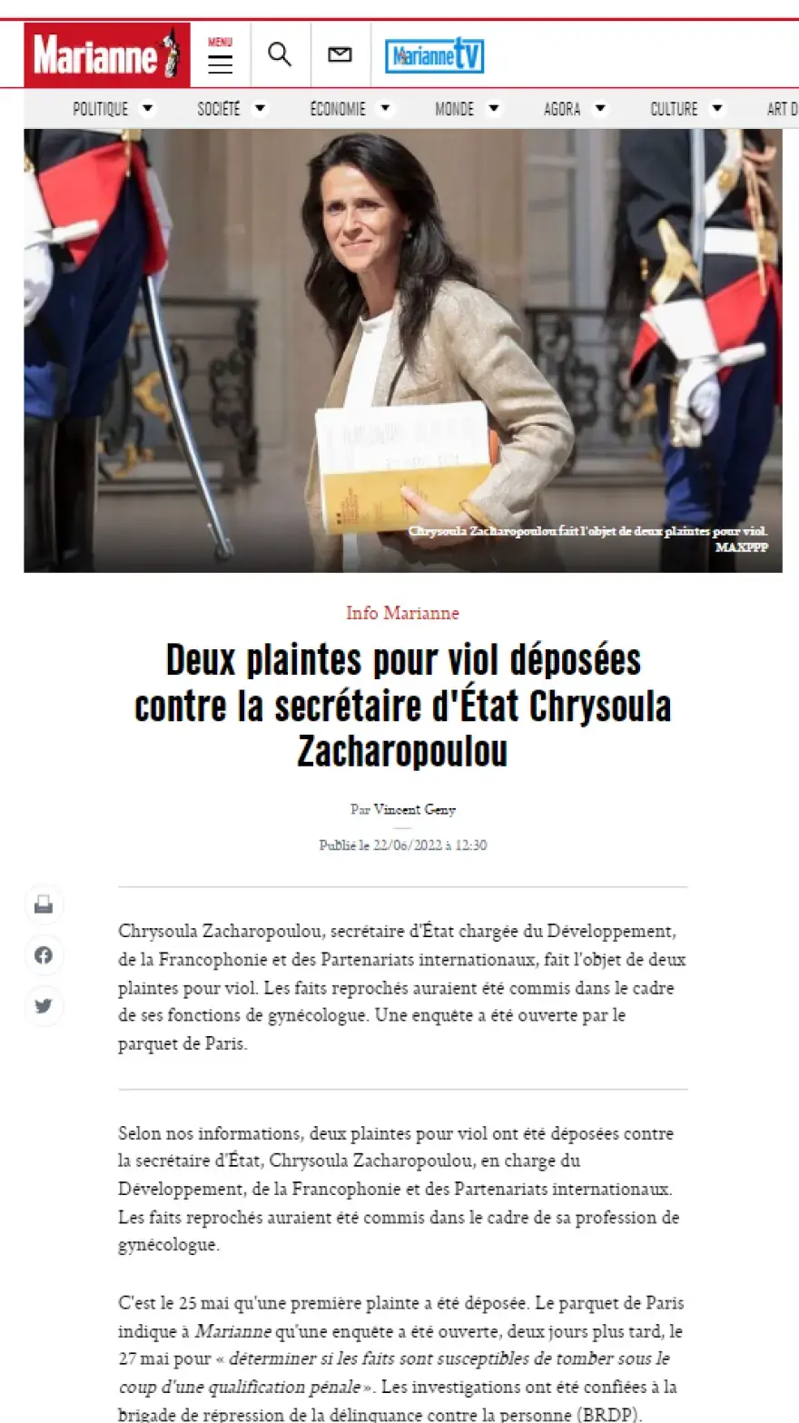 Σύμφωνα με πληροφορίες που επικαλείται το Marianne, έχουν υποβληθεί δύο καταγγελίες για βιασμό σε βάρος της 46χρονης Χρυσούλας Ζαχαροπούλου, με την πρώτη καταγγελία να γίνεται στις 25 Μαΐου. Η εισαγγελία του Παρισίου ανέφερε στο Marianne πως ξεκίνησε μια έρευνα δύο ημέρες αργότερα, στις 27 Μαΐου, για να “διαπιστωθεί εάν τα γεγονότα είναι ποινικά”.