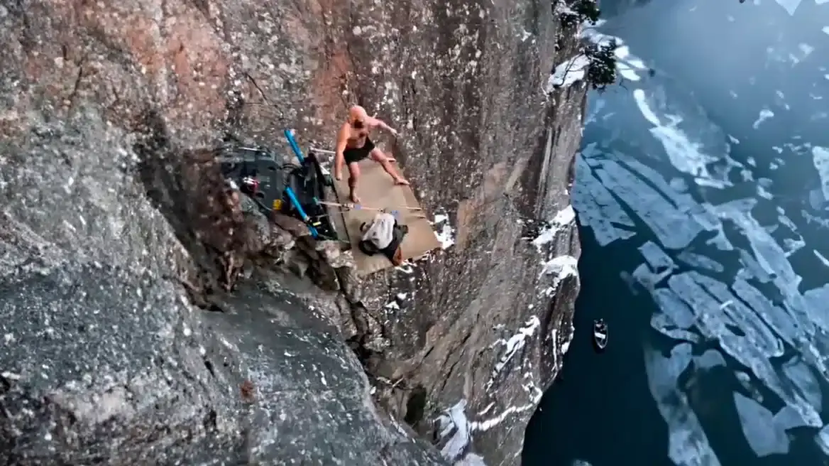 Ο λόγος για τον Κεν Στορνς που έκανε ρεκόρ στο «άλμα του θανάτου» πηδώντας από ύψος 40,5 μέτρων στα κρύα νερά του Στριν της Νορβηγίας.