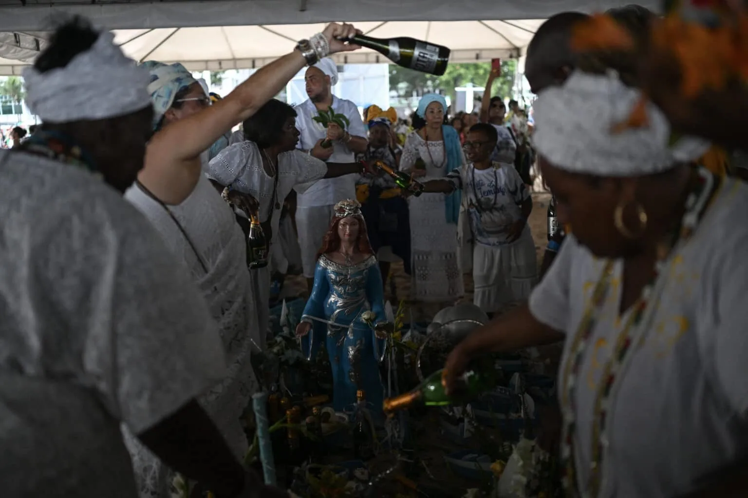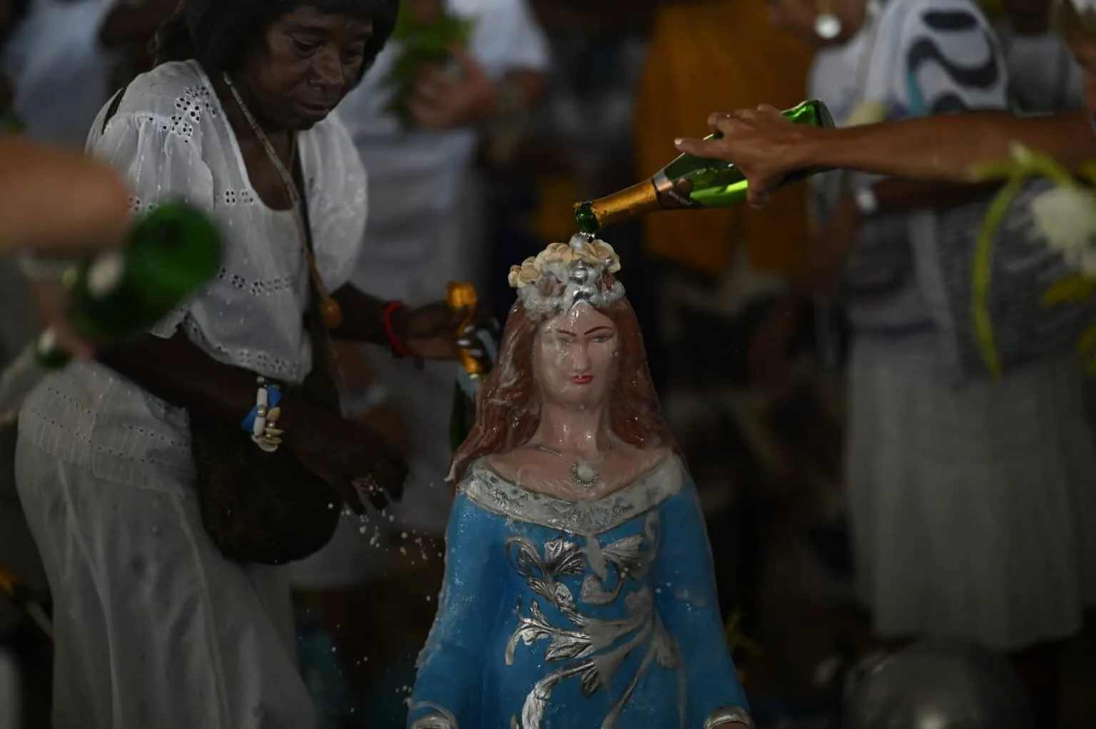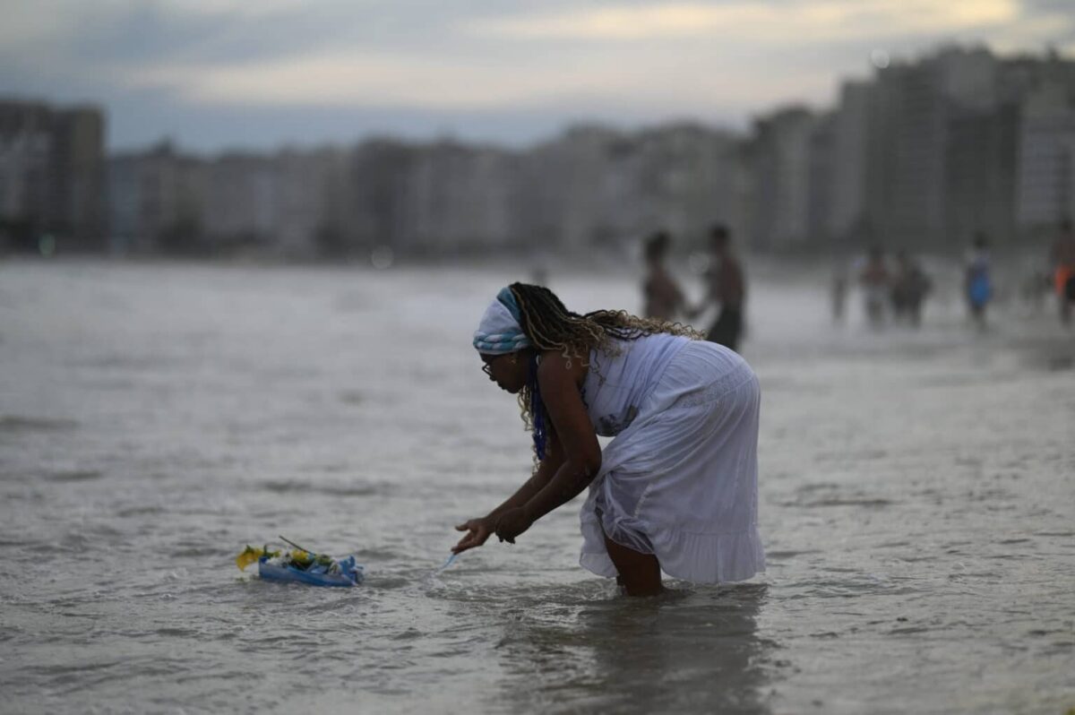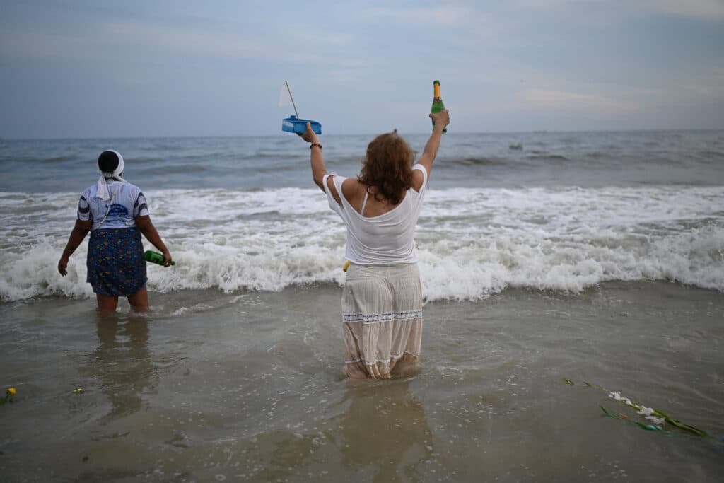 Ντυμένοι στα λευκά, εκατοντάδες συγκεντρώθηκαν στην παραλία, ψέλνοντας ύμνους και προσφέροντας στη θεότητα Γεμάνια -τη Θεά της Θάλασσας- άνθη, γράμματα με ευχές και επιθυμίες για το νέο έτος.