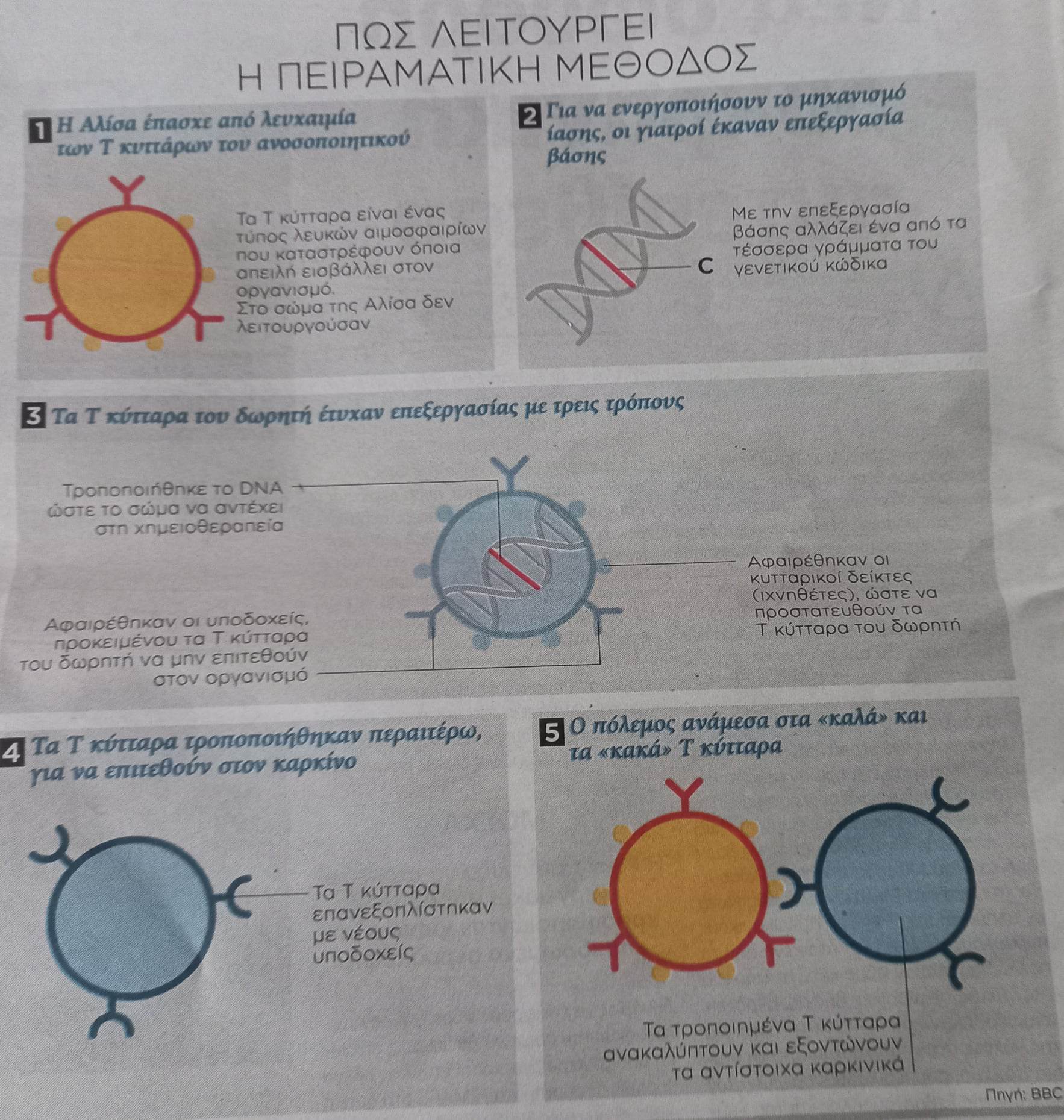 Οι επιστήμονες επενέβησαν στους θεμελιώδεις πυλώνες του κώδικα της ζωής, δηλαδή στα τέσσερα δομικά υλικά (γράμματα) που συνθέτουν μέσα από δισεκατομμύρια βάσεις το ανθρώπινο DNA: Α (αδενίνη), C (κυτοσίνη), G (γουανίνη) και Τ (θυμίνη). Εδώ χρειάστηκε να αλλάξουν τη γενετική δομή μόνο μίας από τις θεμελιώδεις βάσεις, τροποποιώντας μέσα από το γενετικό υλικό του δότη ολόκληρο το «εγχειρίδιο γενετικών οδηγιών» του κοριτσιού. Τελικά πέτυχαν να κατασκευάσουν έναν νέο τύπο Τ λεμφοκυττάρων, τα οποία είχαν την ικανότητα να καταδιώξουν και να σκοτώσουν τα καρκινικά Τ λεμφοκύτταρα στον οργανισμό της Αλίσα.