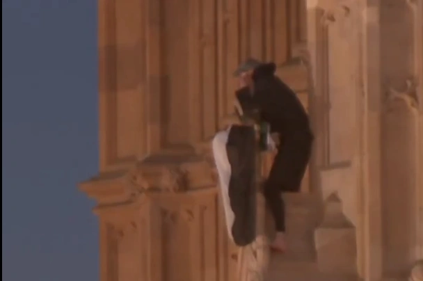 Ο άνδρας είχε γυμνά πόδια, φόραγε μαύρα ρούχα, καπέλο, κουκούλα, κι ανέμιζε παλαιστινιακή σημαία και παραδοσιακή παλαιστινιακή μαντίλα. Παρέμεινε εκεί, πάνω στον πύργο, όλη την ημέρα, ώσπου τελικά κατέβηκε με κλωβό γερανού της πυροσβεστικής αφού έπεσε η νύχτα.