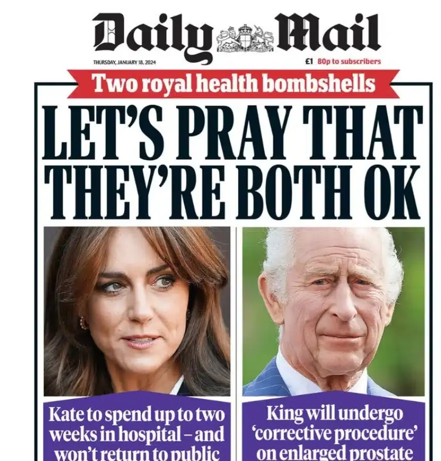 «Ας προσευχηθούμε να είναι και οι δύο καλά στην υγεία τους», γράφει στο σημερινό της πρωτοσέλιδο η βρετανική εφημερίδα «Daily Mail», απεικονίζοντας την Κέιτ Μίντλετον και τον πεθερό της, βασιλιά Κάρολο.