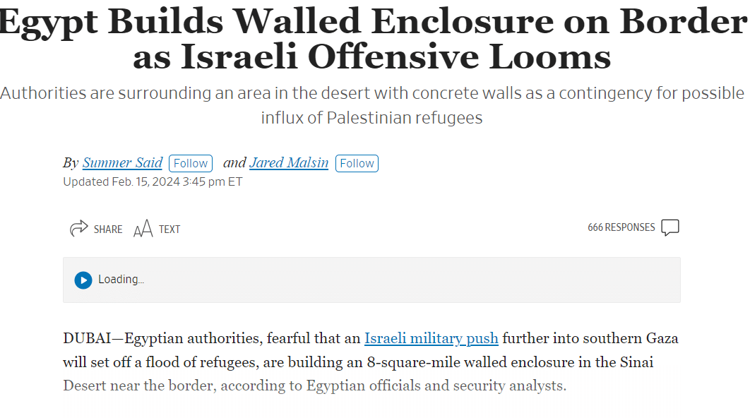 Η κυβέρνηση της Αιγύπτου έφθασε στο σημείο να απειλήσει το Ισραήλ πως θα τερματίσει τη διμερή συμφωνία ειρήνης (1979) αν υπάρξει μαζική εισροή προσφύγων από τη Λωρίδα της Γάζας, πάντα σύμφωνα με τη Γουόλ Στριτ Τζέρναλ.