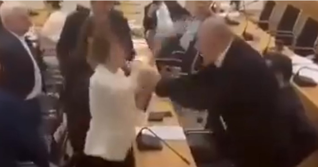 Βουλευτής της αντιπολίτευσης και ενώ η συζήτηση του αμφιλεγόμενου νομοσχεδίου βρισκόταν σε εξέλιξη, πλησίασε συνάδελφό της και τον χτύπησε στο κεφάλι κρατώντας ένα μπουκάλι νερό, την ώρα που εκείνος της απευθυνόταν σε έντονους τόνους κουνώντας το δάχτυλο.
