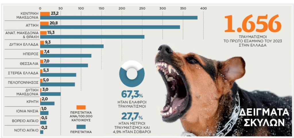 Αντίστοιχα στοιχεία για αύξηση των επιθέσεων σκύλων έχει καταγράψει και η ΕΛ.ΑΣ. Το 2022 σημειώθηκαν 227 επιθέσεις από δεσποζόμενους σκύλους και 383 από αδέσποτους. Στο διάστημα Ιανουάριος-Οκτώβριος 2023, οι επιθέσεις ανέρχονται σε 258 από δεσποζόμενους και 529 από αδέσποτους σκύλους σε όλη την Ελλάδα.