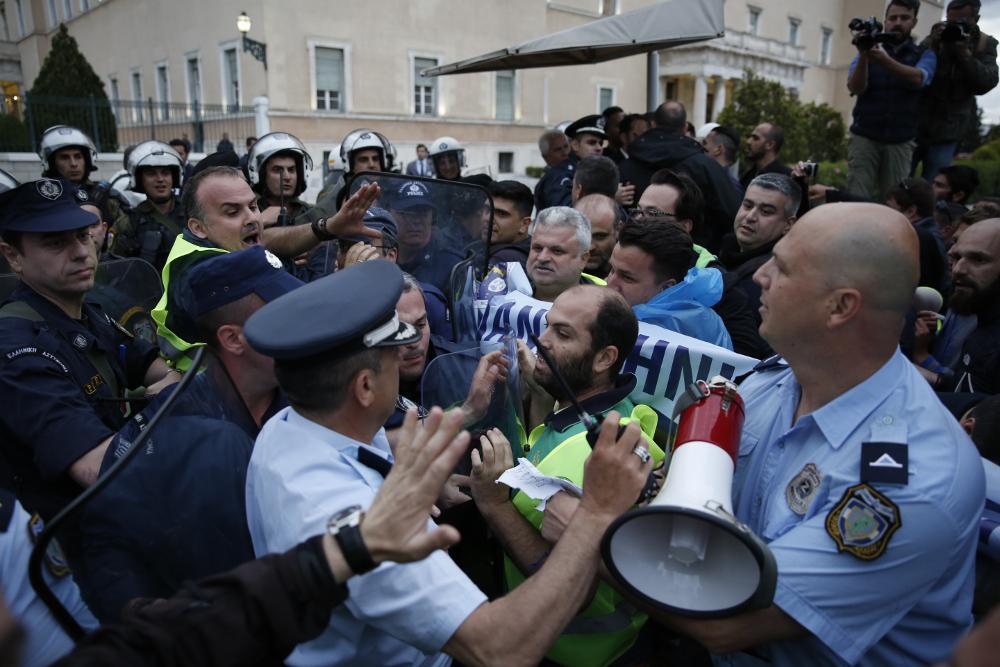 Οι διαδηλωτές περιμένουν να επιτραπεί σε μια αντιπροσωπεία να μπει στη Βουλή για να παραδώσει ψήφισμα με τα αιτήματά τους και διαμαρτύρονται για τα μέτρα που περιλαμβάνει το νομοσχέδιο με το νέο ειδικό μισθολόγιο.