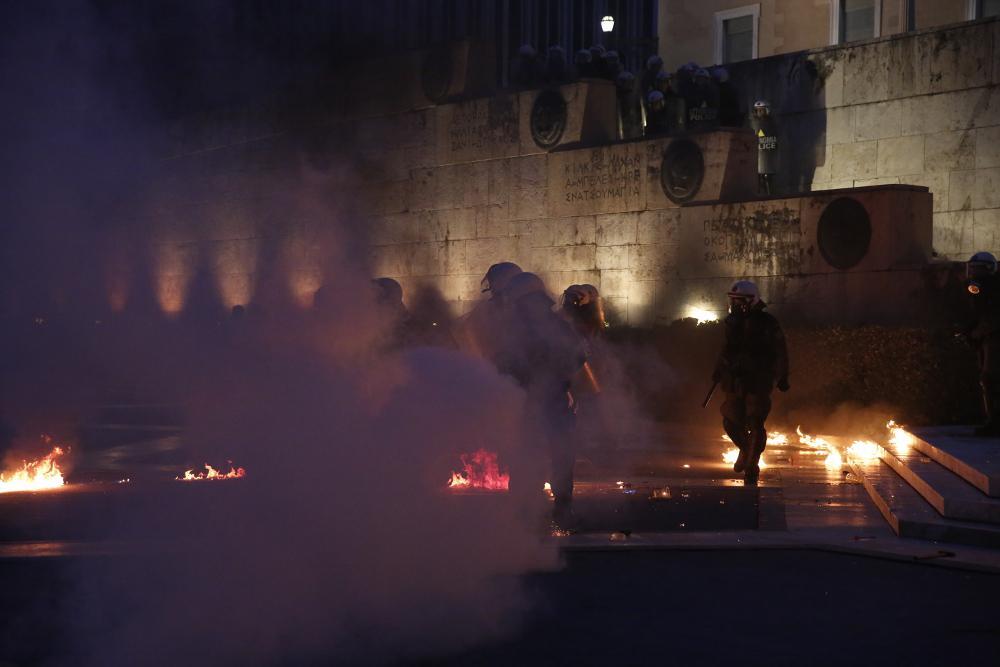 Ομάδα περίπου 30 κουκουλοφόρων επιτέθηκαν στις αστυνομικές δυνάμεις που βρίσκονταν παρατεταγμένες μπροστά από το Μνημείο του Άγνωστου Στρατιώτη και επιχείρησαν να ανέβουν τα σκαλιά για να φτάσουν στο προαύλιο της Βουλής. Τα ΜΑΤ τους απώθησαν ρίχνοντας χημικά και τότε ξεκίνησε η βροχή των μολότοφ.