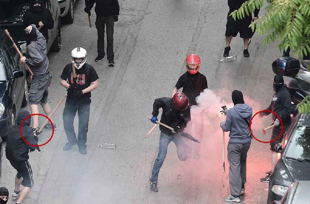 Μετά τις ενισχυμένες μολότοφ τόσο την περασμένη εβδομάδα στα επεισόδια κατά τη διάρκεια των διαδηλώσεων ενάντια στην ψήφιση του 4ου μνημονίου, όσο και σήμερα στα Εξάρχεια, «επιστρατεύθηκαν» τσεκούρια, ρόπαλα, αλλά και στιλέτα!