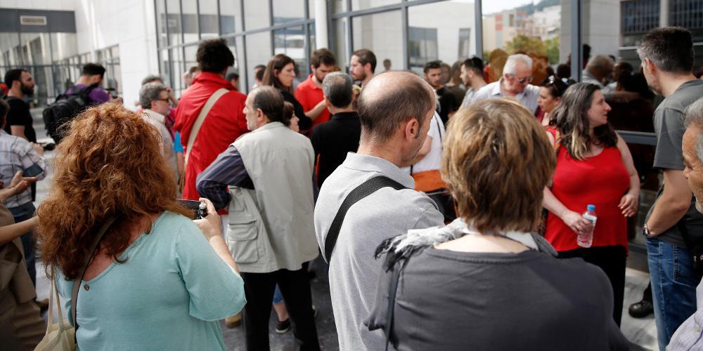 Πολίτες που βρισκόντουσαν στον χώρο του Ειρηνοδικείου Αθηνών για να δηλώσουν την αντίθεσή τους στους πλειστηριασμούς βρέθηκαν πρόσωπο με πρόσωπο με τους συμβολαιογράφους οι οποίοι κάθονταν σε ένα χώρο κοντά στο κυλικείο.