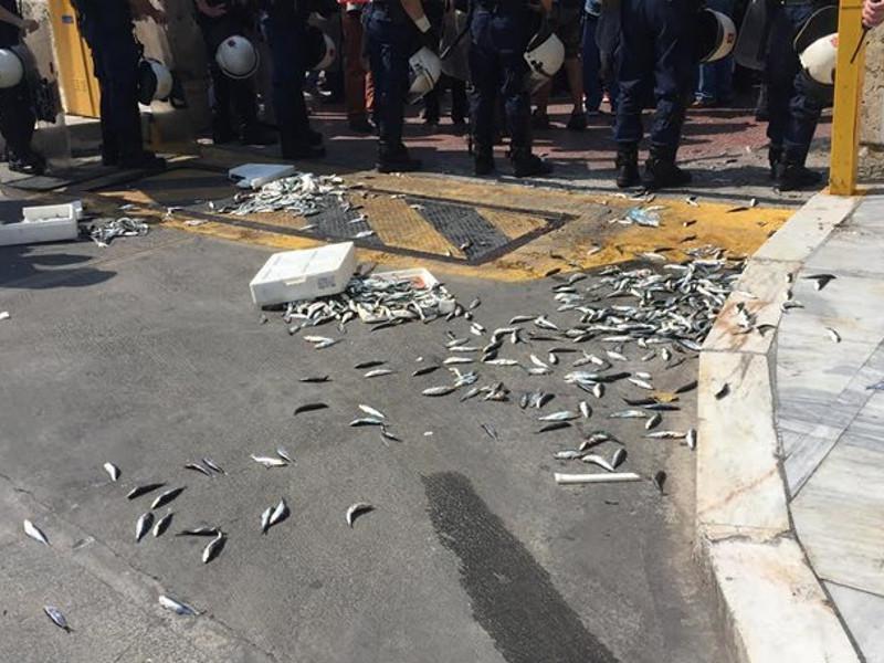 Μάλιστα οι συγκεντρωμένοι, με αφορμή το λόγο της διαμαρτυρίας, πέταξαν σαρδέλες έξω από το κτίριο της Βουλής.