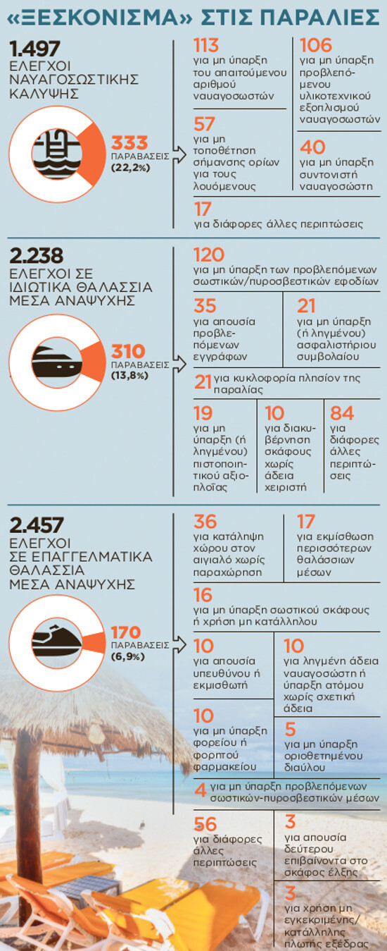 - 2.457 έλεγχοι σε επαγγελματικά θαλάσσια μέσα αναψυχής, κατά τη διάρκεια των οποίων βεβαιώθηκαν 170 παραβάσεις (ποσοστό 6,9%),