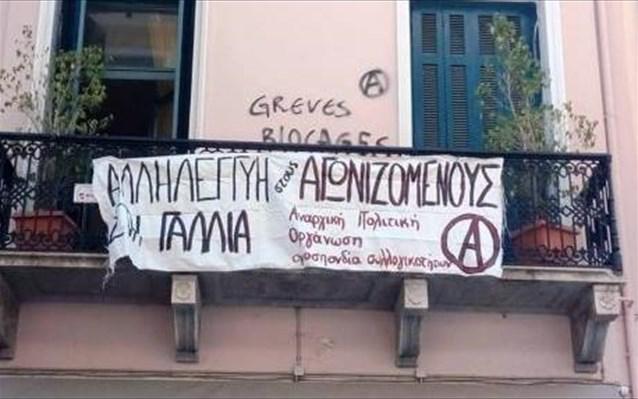 Κατάληψη στο προξενείο της Γαλλίας στην Πάτρα πραγματοποίησε ομάδα αντιεξουσιαστών σε ένδειξη αλληλεγγύης, όπως υποστήριξαν, στους αγωνιζόμενους στη Γαλλία.