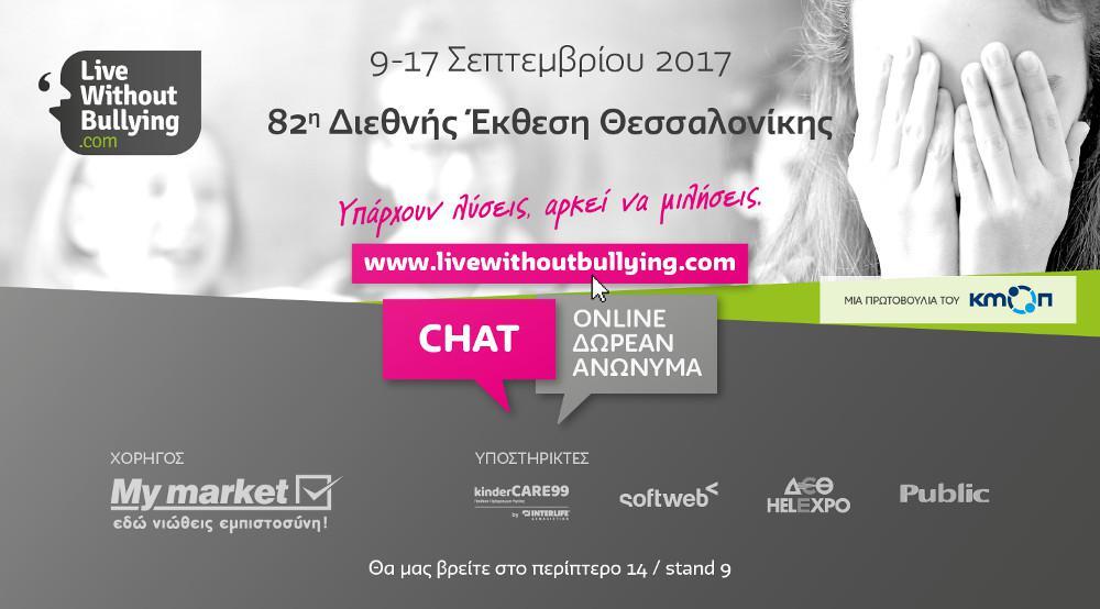 Από το Σάββατο 9 έως και την Κυριακή 17 Σεπτεμβρίου, μέλη της ομάδας του Live Without Bullying θα βρίσκονται στο περίπτερο 14 “Akademia” (stand 9) και σε ειδικά διαμορφωμένο stand στο προαύλιο της έκθεσης, για να ξεναγήσουν τους επισκέπτες στην πλατφόρμα www.livewithoutbullying.com και την σχετική εφαρμογή για κινητά, αλλά και να προσφέρουν αναμνηστικά δώρα στους νεαρούς επισκέπτες.