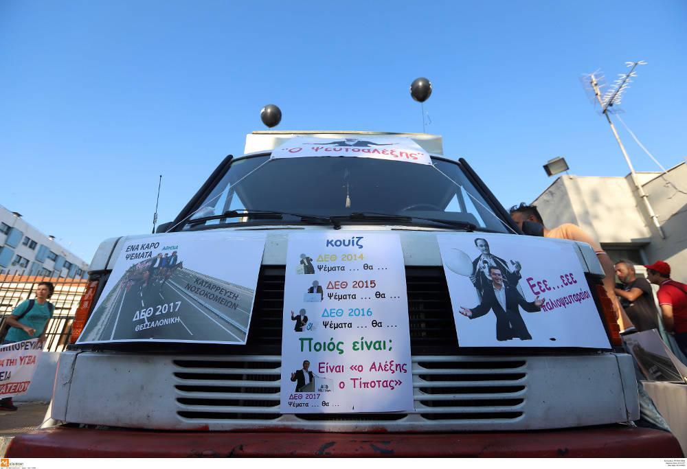 Την παράσταση στην πορεία διαμαρτυρίας είναι το μικρό φορτηγάκι, πάνω στο οποίο υπάρχουν κούκλες με τη μορφή του πρωθυπουργού, Αλέξη Τσίπρα, του υπουργού Υγείας, Ανδρέα Ξανθού, του αναπληρωτή υπουργού Υγείας, Παύλου Πολάκη και του υπουργού Οικονομικών, Ευκλείδη Τσακαλώτου.