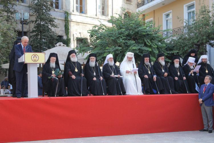 Επίσης υπογράμμισε ότι από τη θέση αυτή, μπροστά στον Ιστορικό Ιερό Καθεδρικό Ναό του Αγίου Τίτου, όπου προ ολίγων ημερών εορτάστηκε με λαμπρότητα η 50ή Επέτειος της Επανακομιδής της Τιμίας Κάρας του Αγίου Αποστόλου Τίτου, Πρώτου Επισκόπου Κρήτης, υποδεχόμεθα ως γεγονός μεγίστης ιστορικής σπουδαιότητας την πραγματοποίηση της Αγίας και Μεγάλης Συνόδου της Ορθοδόξου Εκκλησίας. Αποδίδουμε συνάμα τα αισθήματα ευσεβείας, προσευχών και ελπίδων των συμπολιτών μας, την προσδοκία η Αγία και Μεγάλη Σύνοδος της Ορθοδόξου Εκκλησίας, να φέρει πλούσιους καρπούς, με επιτεύγματα ενότητας, συνεργασίας, προώθησης του διαλόγου, μηνυμάτων αλληλεγγύης, και αναδείξεως των αυθεντικών πτυχών του Χριστιανισμού».