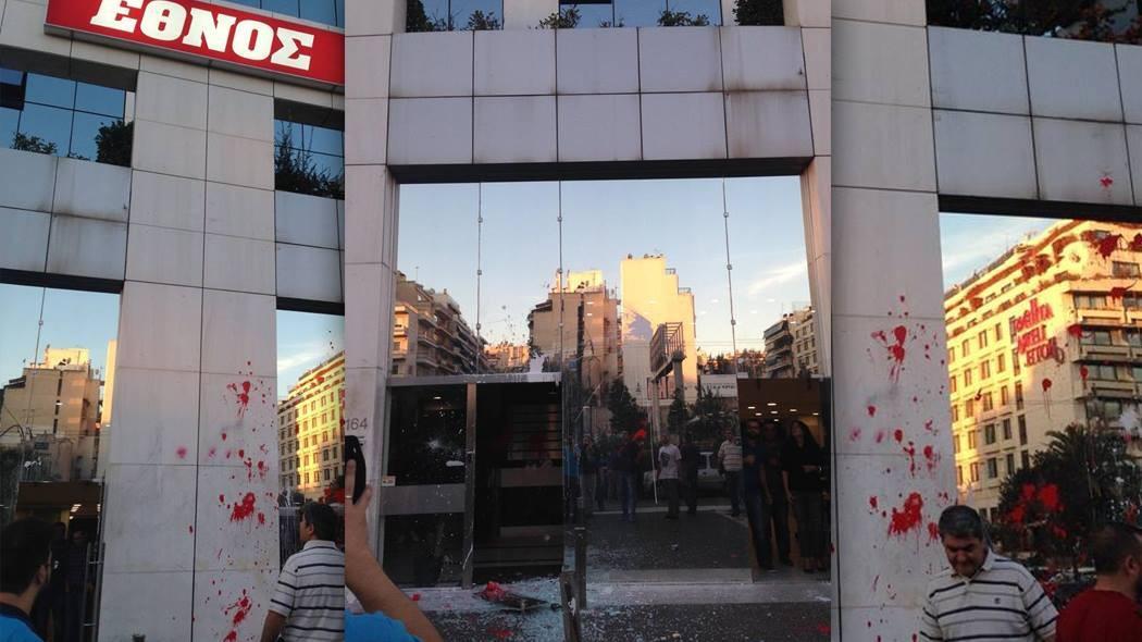 Αρχικά χτύπησαν με ρόπαλα και καδρόνια τις τζαμαρίες της πρόσοψης με αποτέλεσμα να σπάσει μια και να δημιουργηθούν σοβαρές ζημιές στις υπόλοιπες. Στο δρόμο τους βρέθηκαν και δύο δημοσιογράφοι που εκείνη τη στιγμή ήταν έξω από τα γραφεία και ο ένας χτυπήθηκε με γκλομπ στο κεφάλι και ο άλλος με κλωτσιές.