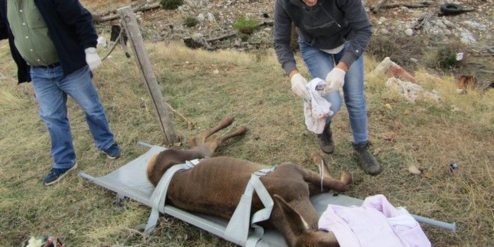 «Το ζώο, που συνοδεύεται από το μικρό του, είναι από εκείνα τα “ήμερα ” ελάφια της περιοχής Ξενία-Καζίνο, που έρχονται να φάνε από τα χέρια των επισκεπτών. Αυτή την εμπιστοσύνη εκμεταλλεύτηκε ο άνθρωπος που το πυροβόλησε, για καλή τύχη του ελαφιού όμως το βλήμα πέρασε από το μάγουλο και βγήκε από το λαιμό χωρίς να πειράξει ζωτικό όργανο. Όπως ήταν αναμενόμενο, το σοβαρό τραύμα κατέβαλε το ζώο, που φαίνεται ότι δεν μπορούσε εδώ και μέρες να φάει. Πήγαμε λοιπόν με το Δασαρχείο, το ζώο αναισθητοποιήθηκε και, προσπαθώντας να καθαρίσουμε τις πληγές, βγάλαμε από το μάγουλό του ολόκληρο το πλαστικό περίβλημα του βλήματος! Το οποίο βλήμα είχε δημιουργήσει και ένα σοβαρό τραύμα κατά την έξοδο. Κρίναμε ότι έπρεπε να μεταφερθεί στο ιατρείο του Αχιλλέα Ακρίβου, του συνεργάτη μας κτηνιάτρου, για να γίνει ραφή του μεγάλου τραύματος. Μετά από κάποιες ώρες, κι αφού χορηγήθηκαν ορός, αντιβίωση και αντιφλεγμονώδη, η ελαφίνα επέστρεψε στο βουνό για να ξανασμίξει με το μικρό της. Οι δασικοί και μέλη της ΑΝΙΜΑ ανέλαβαν την παρακολούθηση της πορείας της υγείας της, μιας και δεν μετακινείται μακρυά από την περιοχή.»