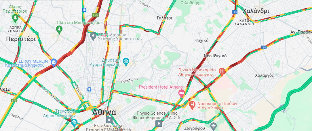 10΄-15΄ από κόμβο Μεταμόρφωσης έως κόμβο Κηφισίας, 5΄-10΄στην έξοδο για Λαμία.
