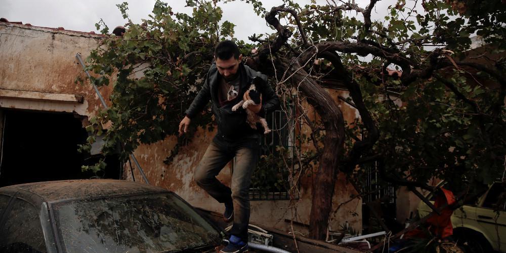 Μέσα σε αυτήν την καταστροφή όμως η εικόνα ενός νεαρού που σώζει ένα γατάκι και ένα σκυλάκι από την «θεομηνία» που έπληξε τις περιοχές γίνετε viral στα social media.