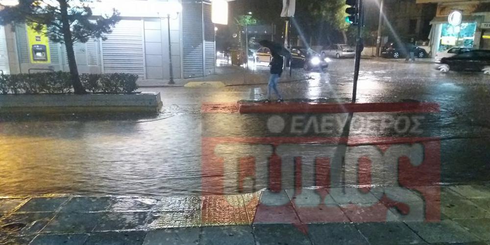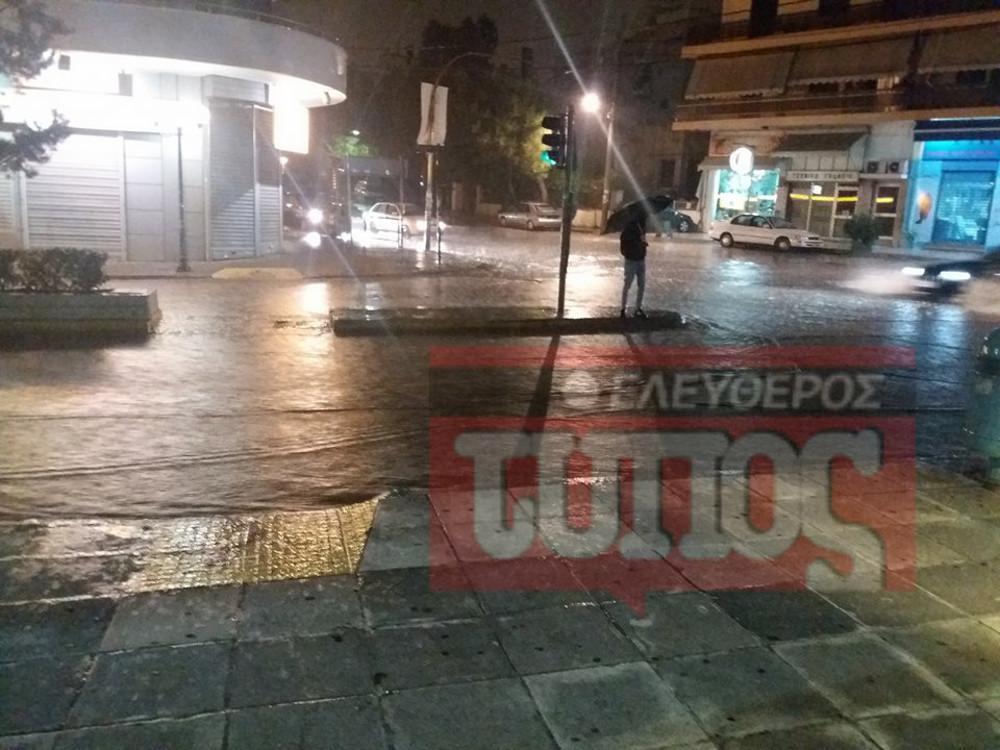 Λίγο μετά τις δέκα το βράδυ ξέσπασε πολύ δυνατή βροχή με συνέπεια οι δρόμοι να μετατραπούν σε ποτάμια, ενώ στο κέντρο έπεσε και χαλάζι.