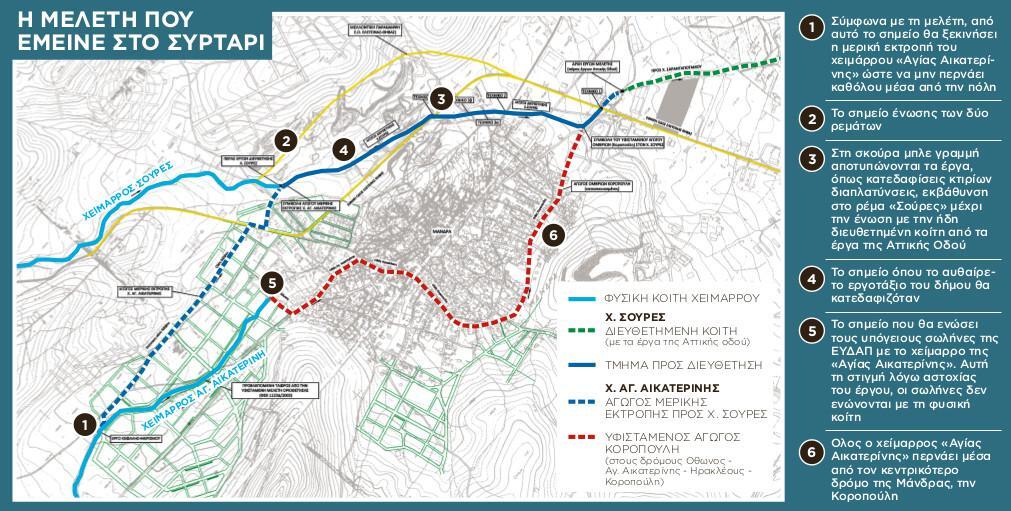 Η εκλεγείσα το 2014 διοίκηση της Περιφέρειας Αττικής βρήκε ουσιαστικά έτοιμη τη μελέτη διευθέτησης των δύο χειμάρρων, αφού είχε πάρει την πρώτη έγκριση από το 2012, από την προηγούμενη περιφερειακή αρχή. Στα τρία χρόνια που πέρασαν το μόνο που έγινε ήταν ότι η μελέτη, την οποία σήμερα παρουσιάζει ο «Ε.Τ.», προστέθηκε στα έργα υψηλής προτεραιότητας, με υψηλό μάλιστα βαθμό ωρίμανσης.