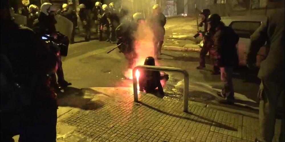 Η άλλη φωτοβολίδα κατέληξε σε ένα αυτοκίνητο το οποίο παραδόθηκε στις φλόγες. Οι ομάδες των κουκουλοφόρων για αρκετές ώρες επιτίθεντο με σφοδρότητα εναντίον των αστυνομικών δυνάμεων, οι οποίες απαντούσαν με χρήση δακρυγόνων. Κατά τη διάρκεια των επεισοδίων τραυματίστηκαν έξι αστυνομικοί. Περίπου στη 01:00 τα ξημερώματα, διμοιρίες των ΜΑΤ κύκλωσαν μια πολυάριθμη ομάδα κουκουλοφόρων στις οδούς Τοσίτσα, Σπύρου Τρικούπη, Στουρνάρη και Σολωμού, προβαίνοντας σε 23 προσαγωγές και 16 συλλήψεις. Κατά τη διάρκεια των συλλήψεων οι αστυνομικοί δέχονταν επιθέσεις από τις ταράτσες κτιρίων της περιοχής, με στόχο την απελευθέρωση των συλληφθέντων.