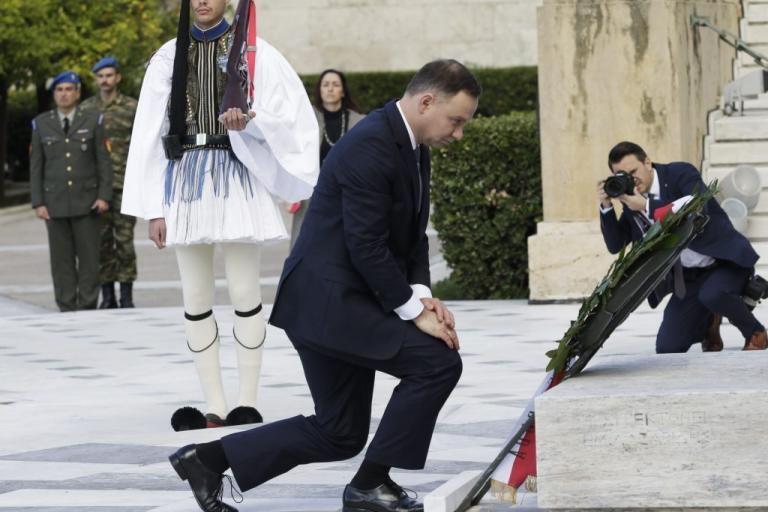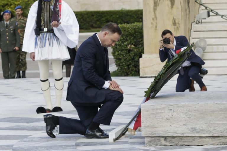 Ο Πρόεδρος της Πολωνίας, έκανε μια κίνηση που εντυπωσίασε όσους βρίσκονταν εκεί. Ο κ. Ντούντα κατέθεσε το στεφάνι και δεν απέτισε φόρο τιμής στους πεσόντες στεκόμενος προσοχή, αλλά γονάτισε μπροστά στον Άγνωστο Στρατιώτη.