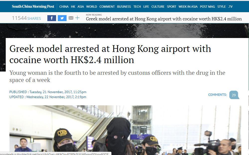 Σύμφωνα με την ηλεκτρονική εφημερίδα South China Morning Post, η νεαρή κοπέλα είναι η τέταρτη γυναίκα που συλλαμβάνεται τις τελευταιές ημέρες στην Κίνα κατά την προσπάθεια τους να εισάγουν κοκαΐνη στην χώρα.