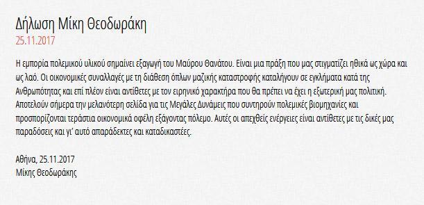 «Η εμπορία πολεμικού υλικού σημαίνει εξαγωγή του Μαύρου Θανάτου» τονίζει ο Μίκης Θεοδωράκης και προσθέτει: «Είναι μια πράξη που μας στιγματίζει ηθικά ως χώρα και ως λαό».