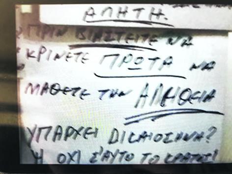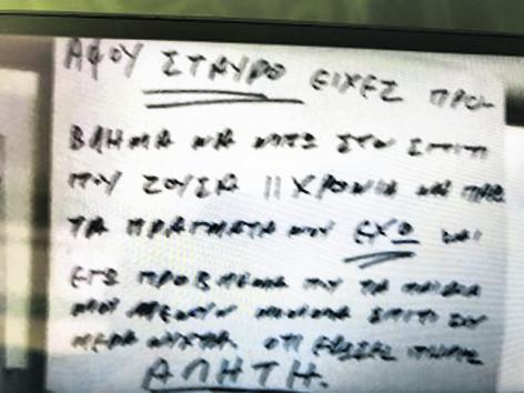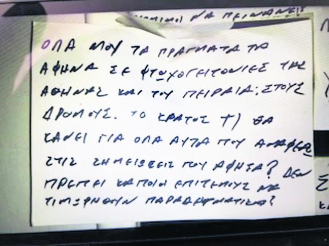 «Αυτός ο άνθρωπος βγάζει μαύρα 30.000 ευρώ τον χρόνο, μαύρα. Ενσημα σε υπαλλήλους του δεν κόλλησε σχεδόν ποτέ! Πώς γίνεται αυτό, με μια δουλειά που επιβάλλει τουλάχιστον δύο άτομα αν όχι τρία; Το ΙΚΑ τι θα κάνει για αυτό; Γιατί συνεχίζει να δουλεύει μαύρα; Να παίρνει σύνταξη και κάποιος άλλος που είναι νόμιμος να πεινάει;», έγραψε λίγο πριν πραγματοποιήσει την πράξη του. «Ολα μου τα πράγματα, τα άφησα σε φτωχογειτονιές της Αθήνας και του Πειραιά. Στους δρόμους. Το κράτος τι θα κάνει για όλα αυτά που αναφέρω; Στις σημειώσεις που άφησα; Δεν πρέπει κάποιοι επιτέλους να τιμωρηθούν παραδειγματικά;», έγραφε στο τελευταίο του σημείωμα.