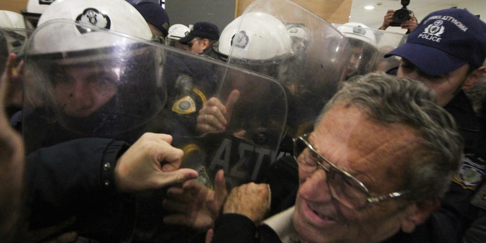 Τα ΜΑΤ απέκλεισαν την αίθουσα του δικαστηρίου και δεν επέτρεψαν στα μέλη του κινήματος «δεν πληρώνω», τις άλλες συλλογικότητες, τα μέλη της Λαϊκής Ενότητας και στα μέλη του ΠΑΜΕ να μπουν μέσα ώστε να προσεγγίσουν τους συμβολαιογράφους. Ακολούθησε πρωτοφανής ένταση, μάχες σώμα με σώμα, ενώ έπεσαν ακόμη και χημικά εντός του κτιρίου.