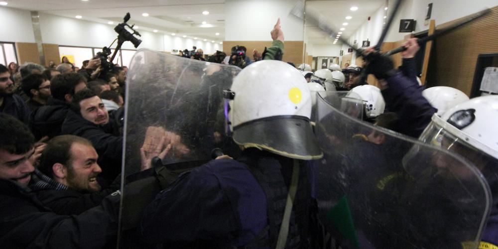 Η πρωτοφανής κίνηση των αστυνομικών της Υποδιεύθυνσης Μέτρων Τάξης να ρίξουν χημικά στα μέλη των κινημάτων που αντιδρούν στην πραγματοποίηση των πλειστηριασμών ανάγκασε τους δεκάδες αλληλέγγυους να αποχωρήσουν από το χώρο των δικαστηρίων. Μάλιστα είχαμε και τρεις τραυματίες στα επεισόδια που προηγήθηκαν μεταξύ των διαμαρτυρομένων και των ΜΑΤ, αφού οι αστυνομικοί χρησιμοποίησαν γκλομπς για να απομακρύνουν τα μέλη των κινημάτων.