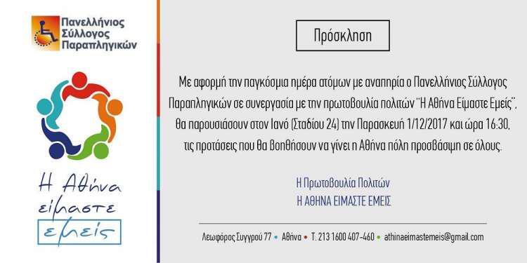 Στην εκδήλωση θα συζητηθεί το μεγάλο πρόβλημα της προσβασιμότητας στην Αθήνα των ατόμων με αναπηρία και θα παρουσιαστούν οι προτάσεις της πρωτοβουλίας πολιτών «Η Αθήνα Είμαστε Εμείς» για μια Αθήνα προσβάσιμη, ασφαλή και ανοικτή σε όλους. Οι προτάσεις της πρωτοβουλίας διαμορφώθηκαν με την συνεργασία φορέων ατόμων με αναπηρία, εκπρόσωποι των οποίων θα μιλήσουν για τα προβλήματα προσβασιμότητας στην πόλη.