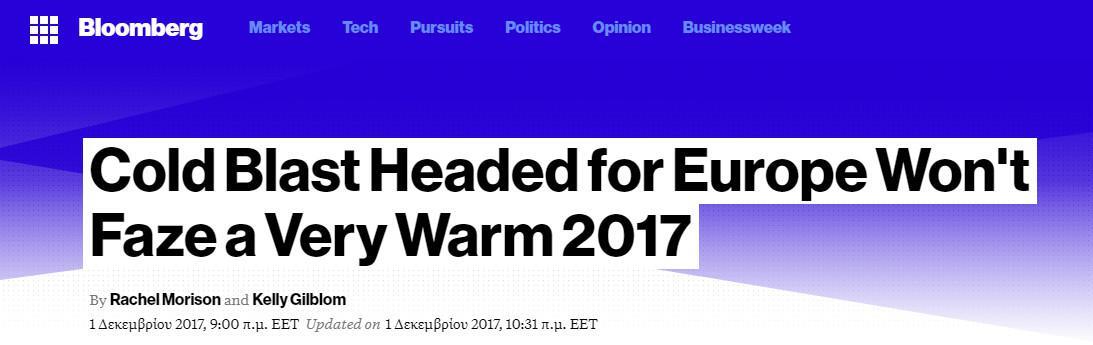 Σύμφωνα με οκτώ μετεωρολόγους που πήραν μέρος σε έρευνα του πρακτορείου Bloomberg, το πρώτο δεκαπενθήμερο του μήνα θα είναι ασυνήθιστα κρύο. Όπως υποστηρίζουν το “ρεκόρ” ψύχους, οφείλεται στο γεγονός ότι υψηλές πιέσεις κοντά στην Ισλανδία και τη βορειοδυτική Ρωσία «ωθούν» τους παγωμένους αρκτικούς ανέμους νοτιότερα, προς την ήπειρό μας.