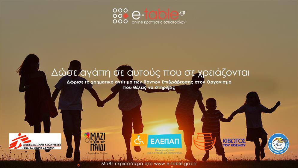 Το e-table.gr, η πρώτη ολοκληρωμένη υπηρεσία για δωρεάν online κρατήσεις σε εστιατόρια, δίνει πλέον τη δυνατότητα στους χρήστες του να εξαργυρώνουν τους Πόντους Επιβράβευσης, που έχουν συγκεντρώσει κάνοντας χρήση της υπηρεσίας, σε δωρεές που ξεκινούν από 5 ευρώ σε 5 Μη Κερδοσκοπικούς Οργανισμούς.