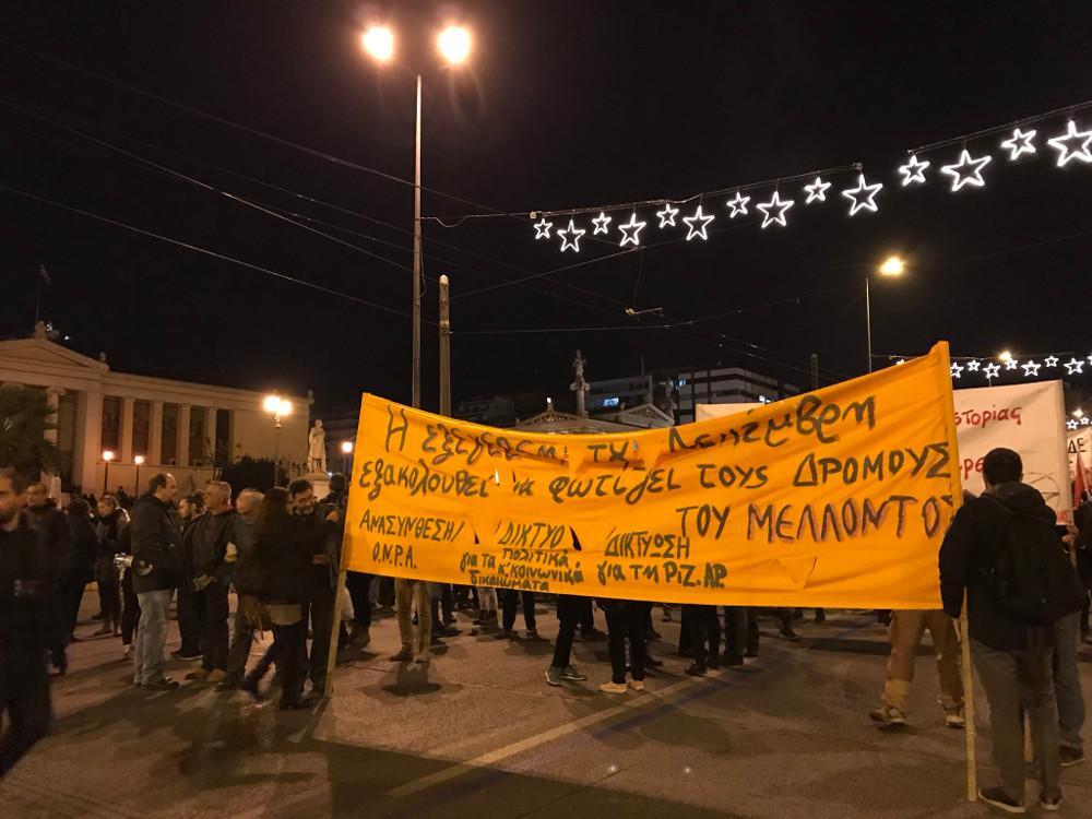 Την ίδια στιγμή σε εξέλιξη είναι η πορεία που ξεκίνησε στις 6 το απόγευμα από τα Προπύλαια προς το σημείο που δολοφονήθηκε πριν 9 χρόνια ο 15χρονος μαθητής Αλέξανδρος Γρηγορόπουλος.