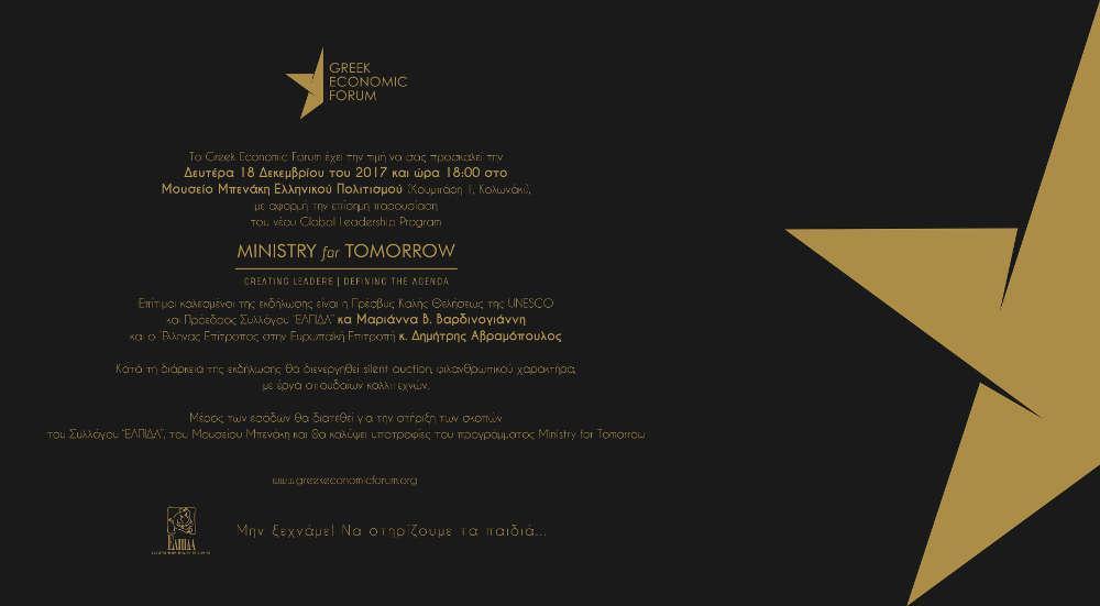 Τον Δεκέμβριο του 2016 ο Πρόεδρος της Ελληνικής Δημοκρατίας αναγνώρισε το έργο και τη δράση του Greek Economic Forum αναδεικνύοντάς μας ως πρεσβευτές της Ελλάδας στον κόσμο. Σήμερα είμαστε έτοιμοι να ανοίξουμε ένα νέο κεφάλαιο για την ελληνική κοινωνία μέσα από το ειδικά διαμορφωμένο ηγετικό μας πρόγραμμα «Ministry for Tomorrow».